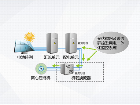 光伏發(fā)電系統(tǒng)不發(fā)電,主機(jī)向電網(wǎng)取電運(yùn)行,機(jī)組相當(dāng)于常規(guī)高效變頻離心機(jī)。