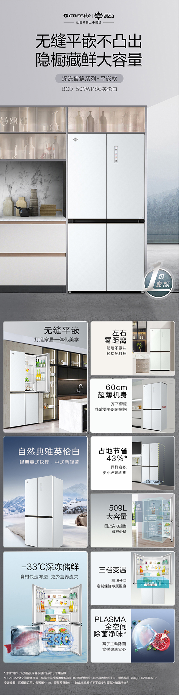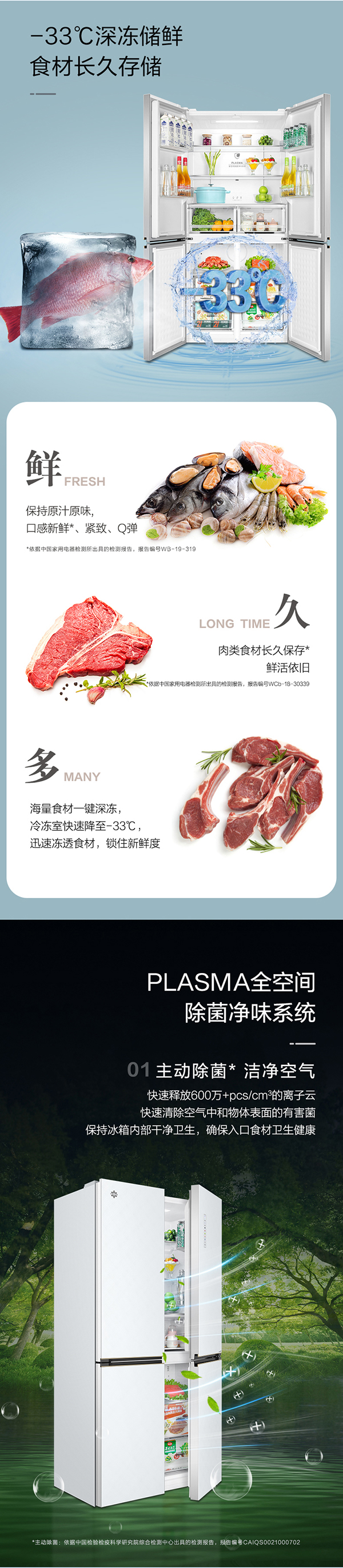 -33攝氏度深凍儲(chǔ)鮮;PLASMA全空間除菌凈味;平齊不凸出;雙通道循環(huán)散熱