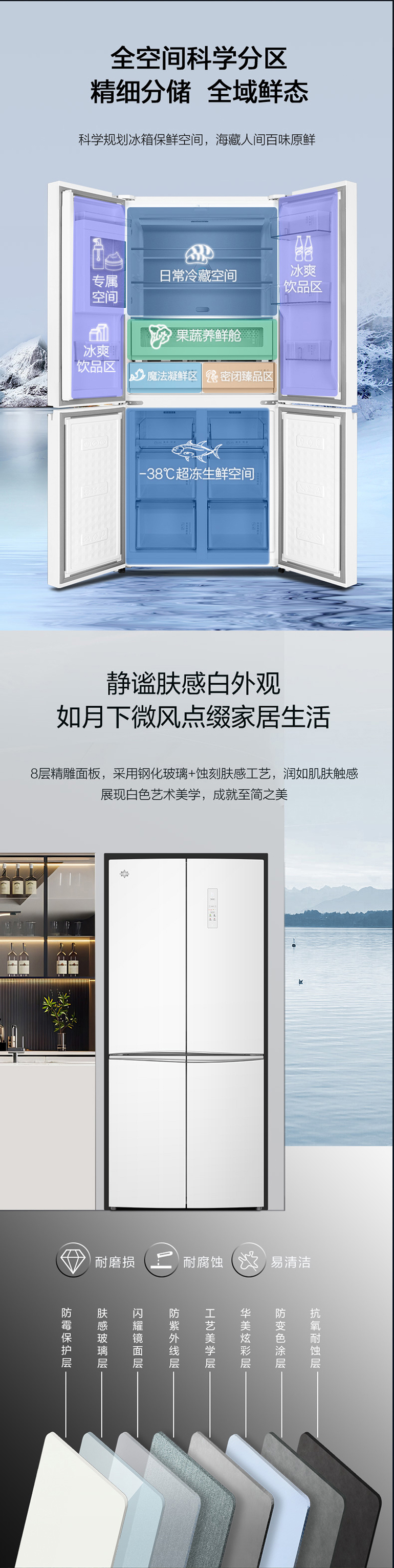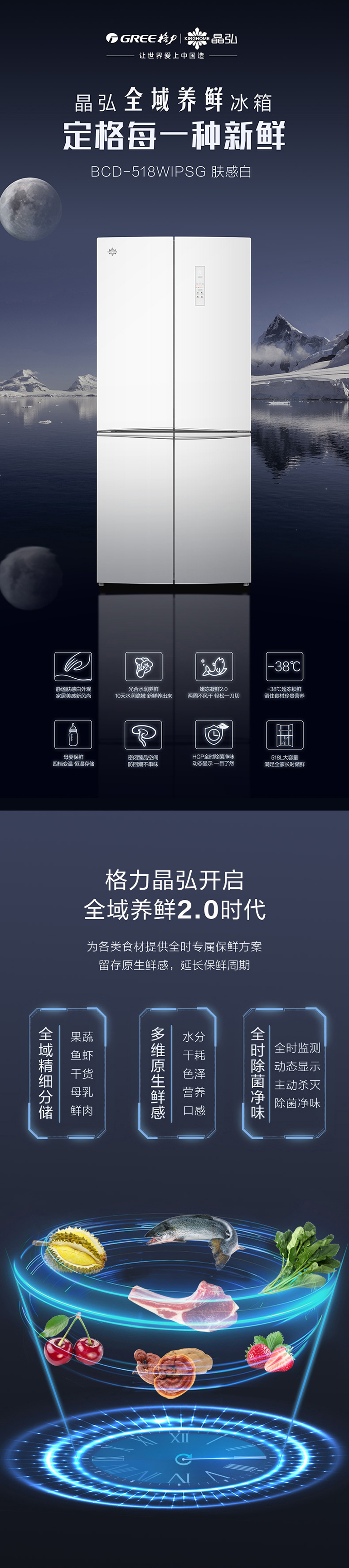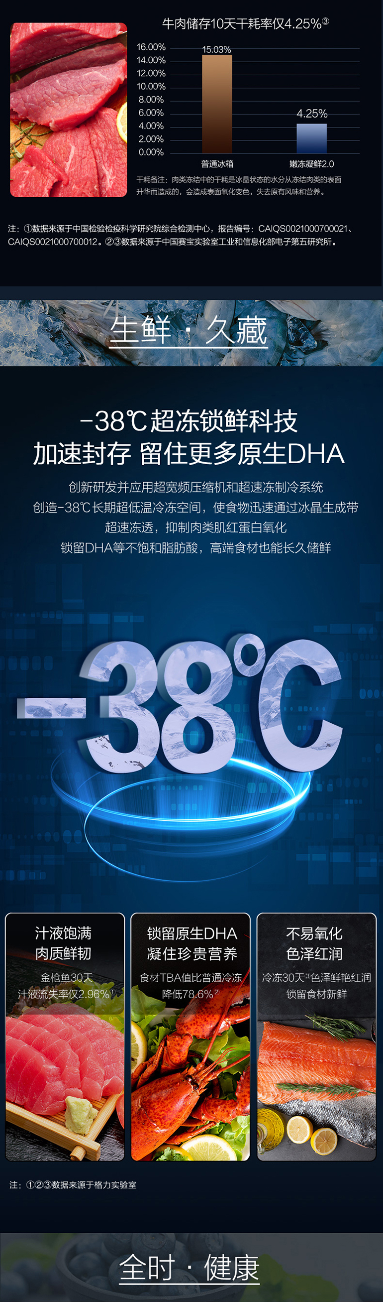 -38℃超凍鎖鮮;光合水潤(rùn)養(yǎng)鮮;嫩凍凝鮮2.0;HCP全時(shí)除菌凈味