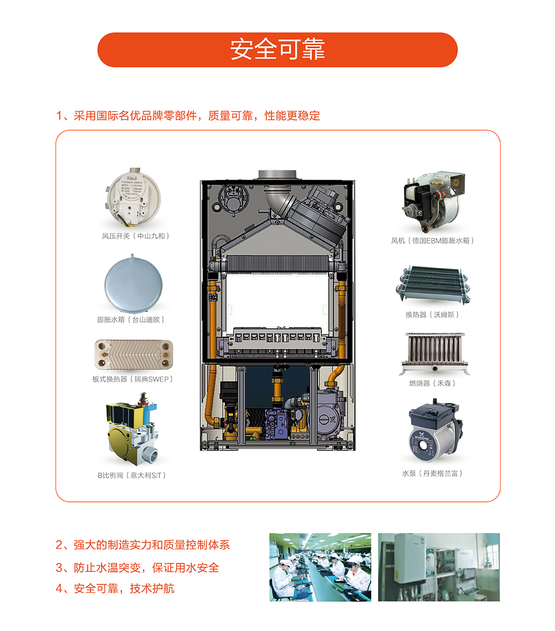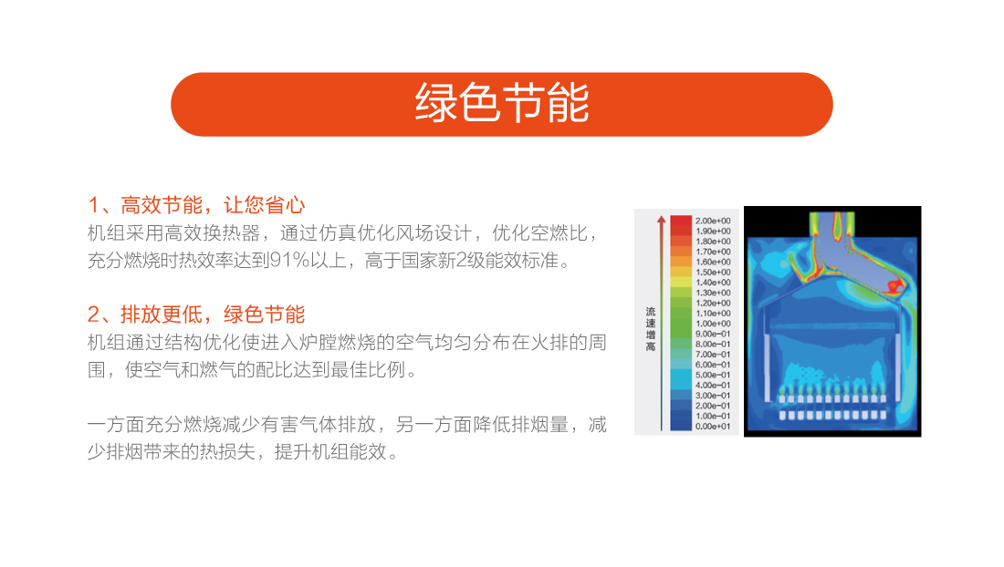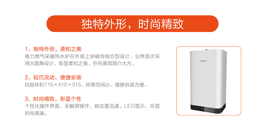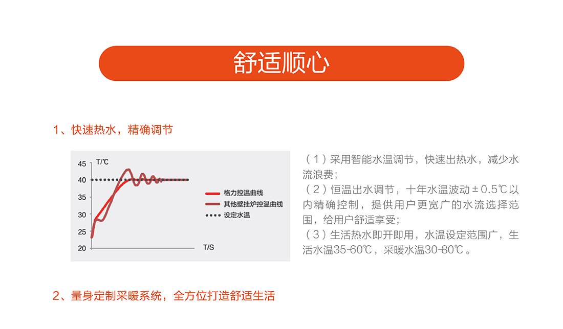 充分燃燒效率達到90%以上,采用智能水溫調(diào)節(jié),快速出熱水,減少水流浪費,恒溫±0.5℃以內(nèi)精確控制,生活水溫度35-60℃,采暖水溫30-80℃。